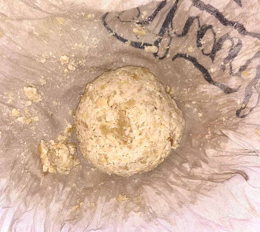 At this point, I separated the paste into two balls. I mixed a few tablespoons of nutritional yeast, salt and pepper, a little olive bring, and some olive brine into the mix. This was not detailed in Ein Buch von guter Speise, but I figured that after my hours of toil I deserved something slightly closer to cheese.